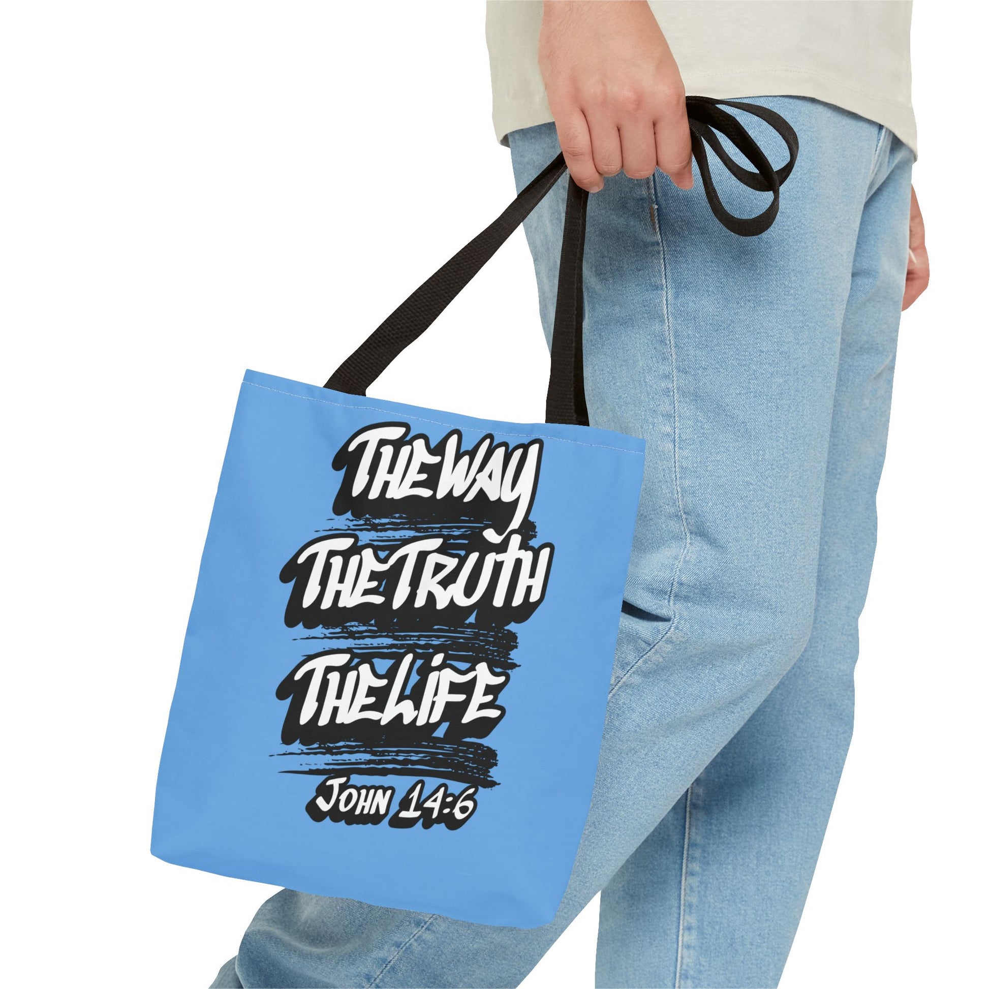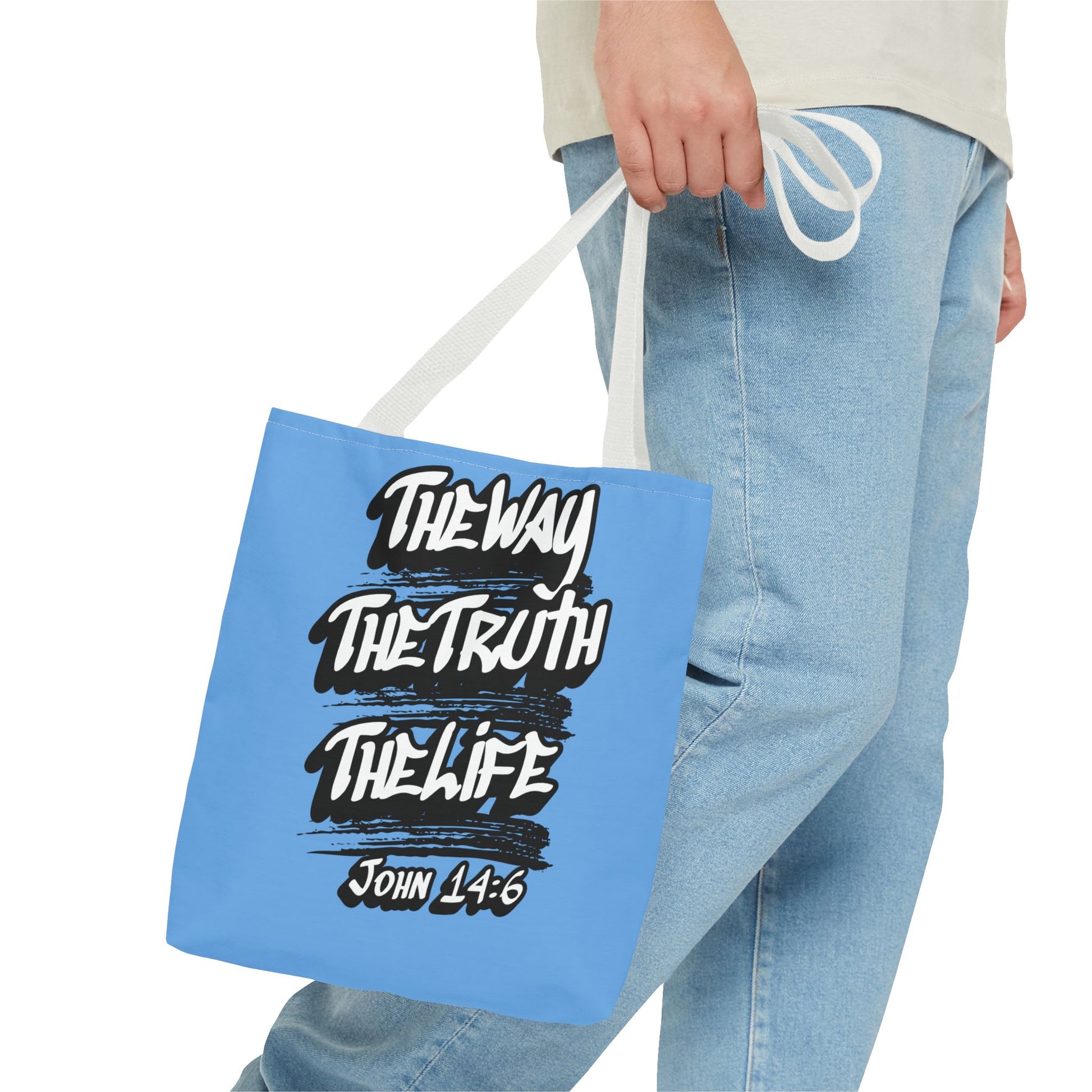 Carry a quiet declaration of faith with you each day. This roomy polyester tote blends bold brush-lettering and minimalist iconography on a calming sky-blue background. The front proclaims “The Way, The Truth, The Life — John 14:6” in energetic hand-painted strokes, while the reverse shows a simple crown—an understated symbol of reverence. It feels light on the shoulder, holds its shape, and keeps daily essentials organized thanks to boxed corners and a large main compartment. Wear it to church, Bible study, community outreach, or strolls through town — it reads like a gentle reminder of identity and purpose without shouting.
